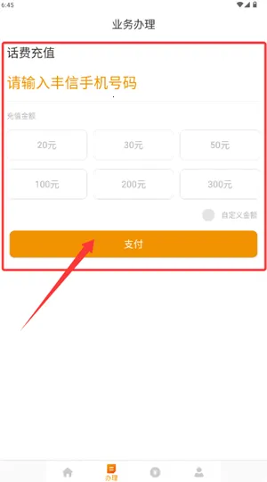 4、进入业务办理页输入手机号并选择充值金额,点击支付即可完成充值。