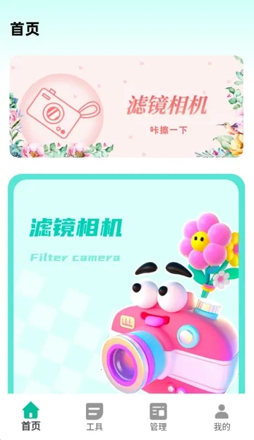 2、进入软件首页,可使用滤镜相机进行拍摄等