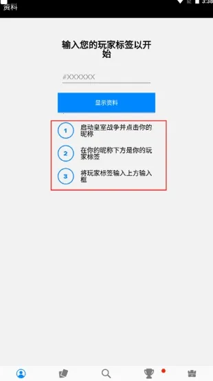 在上方显示XX的地方输入你玩家昵称下方的标签,就能显示您作为皇家战争玩家的所有资料。
