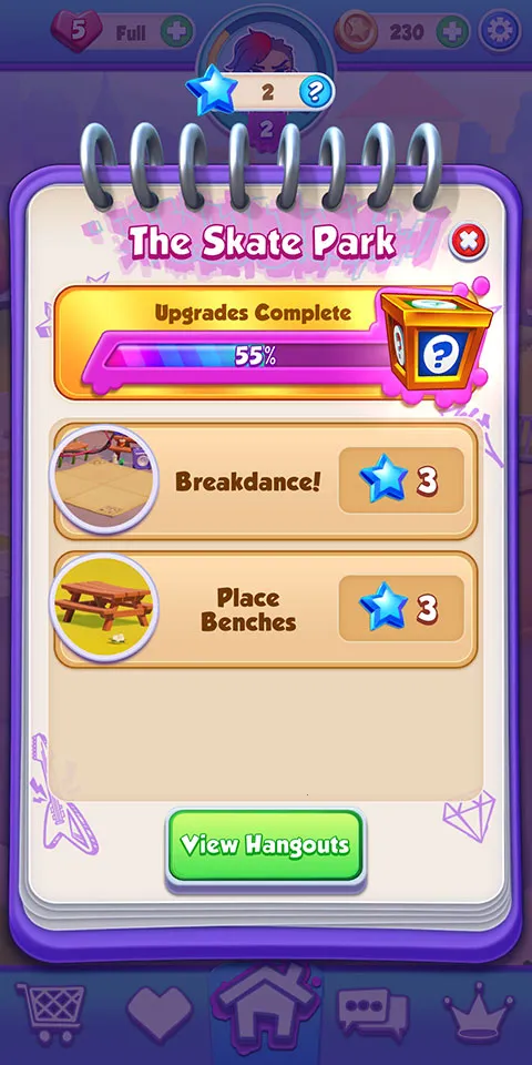 3. 可装饰聚会场所:通过收集星星装饰聚会场所,每次升级场景都会焕然一新,升级进度满 100 还能解锁新主题场景。