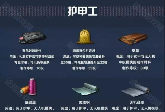 背包时装制作、皮革制作术、4级背包扩容袋、缝纫线制作术、护甲福至心灵、无机硅胶。
