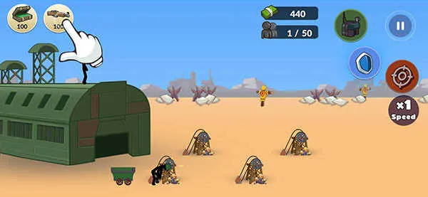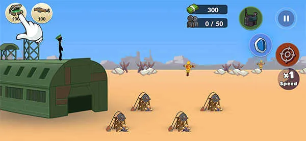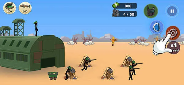 1、下载进入火柴人第二次世界大战游戏界面后,首选购买两个采矿兵;